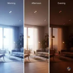 Smart Bulb Solution: You can buy smart light bulbs that change color and brightness throughout the day automatically. They can be bright white in the morning, warm and bright during the day, and dim orange in the evening.