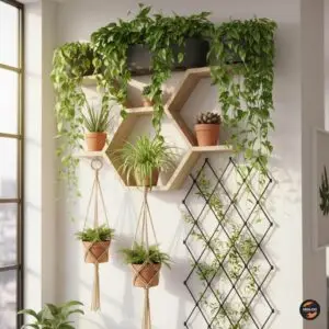 Climbing Plants with Trellises: Plants like pothos or philodendron can climb up simple hooks or strings attached to your wall.